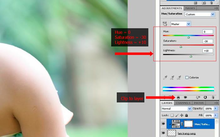 - Gán các thông số cho Hue/Saturation : Hue = 0, Saturation = -30, Lightness = +10