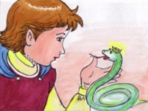Nhưng chiếc thuyền không đắm, lơ lửng trôi đến một bến xa lạ rồi đứng lại. Anh thanh niên lên bờ, thấy đằng xa có một tòa lâu đài, liền đi về hướng ấy, anh vào thì thấy lâu đài bị phù phép, anh qua các phòng, phòng nào cũng trống rỗng. Ở phòng cuối cùng, anh nhìn thấy một con rắn nước. Đó là một cô gái bị phù phép. Cô thấy anh mừng rỡ bảo: